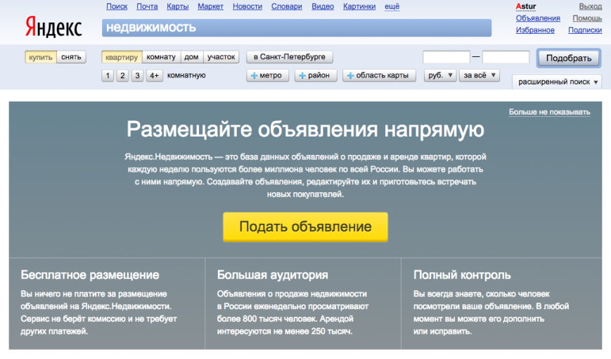 Итак, первым и, наверное, одним из наиболее ожидаемых нововведений стала возможность размещения объявлений от пользователей. Еще недавно, сервис собирал информацию с сайтов-партнеров, таких как Allpn.ru и другие и не давал возможности размещения частных объявлений. Теперь же любой, кто зарегистрирован на Яндекс Почте имеет возможность разместить собственное объявление о покупке, продаже, желании сдать или снять в аренду недвижимость. В отличии от объявлений сайтов-партнеров, для пользователей разработчики